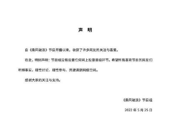 针对多家公司号召员工为王心凌投票一事,《乘风破浪》节目组发布声明,称没有设置网上投票晋级环节。